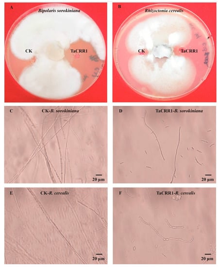 When B. sorokiniana and R. cerealis mycelia plugs were separately inoculated in the center of the PDA medium and cultured for 2 days at 25 °C, the purified His-TF-TaCRR1 protein (1 μmolL−1) and control His-TF protein (CK, 1 μmolL−1) were separately injected into each small pore of the PDA medium. As a result, His-TF-TaCRR1 obviously inhibited the mycelia growth of B. sorokiniana and R. cerealis in these PDA media compared with the His-TF treatment (Figure 5A,B). Microscopy/photography images showed that the hyphae of B. sorokiniana on the edge treated by His-TF control (CK) were intact and well developed (Figure 5C), whereas the hyphae of B. sorokiniana on the edges of the inhibition zones treated with His-TF-TaCRR1 were deformed and lysed (Figure 5D). In addition, the antifungal activity to R. cerealis could be observed by microscope (Figure 5E,F). These results suggested that TaCRR1 protein restrained the mycelia growth of B. sorokiniana and R. cerealis.