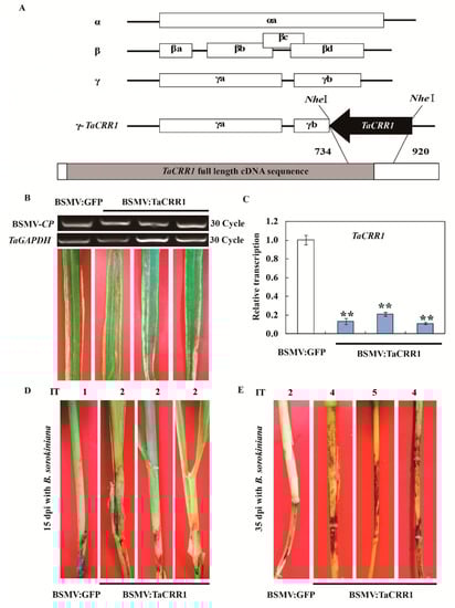 The 186bp-length fragment specific of TaCRR1 (no. 734 to 920 nt in the TaCRR1 cDNA sequence) with NheI and MluI restriction sites was sub-cloned from the cDNA sequence of the CI12633 and inserted into the RNA γ chain of BSMV genomes in antisense orientation for gene silencing (Figure 6A). The Si-Fi software was used for the off-target prediction of the VIGS construct. Following Holzberg et al. [] and Zhu et al. [], the tripartite cDNA chains of BSMV virus genomes were separately linearized and transcribed into RNAs. Then, they were mixed and then inoculated onto the leaves of R. cerealis-resistant wheat cv. CI12633 or B. sorokiniana-resistant wheat cv. Yangmai 6 at the three leaf stage. Inoculated plants were grown at ~90% relative humidity for 7 days.