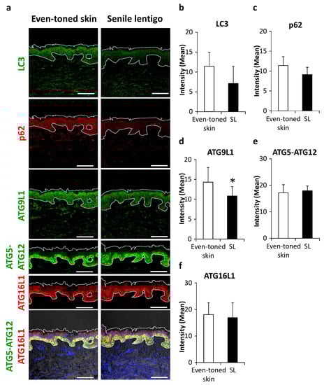 Subsequently, some essential proteins in autophagy machinery were visualized. LC3, an autophagosome marker, tended to be decreased in SL as compared with the even-toned skin regions (Figure 2a,b), with a similar trend seen for p62 protein, a substrate of autophagy (Figure 2a,c). Among a series of autophagy-related proteins (ATGs), ATG9L1 protein and the ATG5-ATG12-ATG16L1 complex, involved in the initiation of isolation membranes and targeting LC3 to autophagosomes, respectively, were subjected to further analysis. ATG9L1 was significantly decreased in SL (Figure 2a,d). Furthermore, while the above-mentioned proteins showed a granular layer-enriched localization, ATG5-ATG12 and ATG16L1 proteins were dominantly distributed in basal keratinocytes (Figure 2a). While there was no significant change in these targets, the signals were more extended from the basal to suprabasal layers in SL (Figure 2a,e,f).