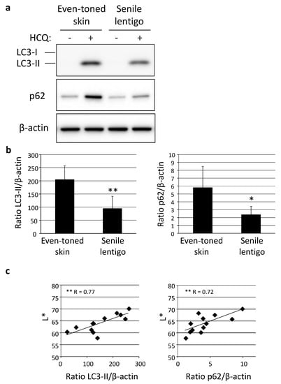 Following immunohistochemical analysis, autophagic activity was examined in skin tissues using an autophagic flux assay, in which the turnover of both LC3-II and p62 can be estimated in the presence and absence of an autophagic inhibitor, such as hydroxychloroquine (HCQ) []. Western-blotting analysis clearly demonstrated a significantly lower level of autophagic activity in SL than in even-toned skin (Figure 3a,b). In addition, autophagy flux was shown to be significantly correlated with skin lightness (L*), determined by use of a chromameter (Figure 3c).