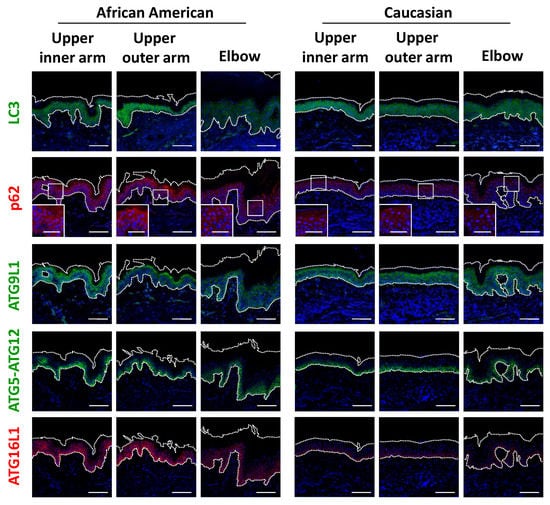 Impaired autophagy proteins in hyperpigmented skin. (a) Skin tissues from upper inner arm, upper outer arm and elbow regions of AA and Caucasian subjects were subjected to immunofluorescent analysis. Merged images of LC3 (green), p62 (red), ATG9L1 (green), ATG5-ATG12 (green) or ATG16L1 (red), and DAPI nuclear staining are presented. Lower insets show magnification of areas inside white rectangles. Bars = 100 μm or 50 μm (insets).