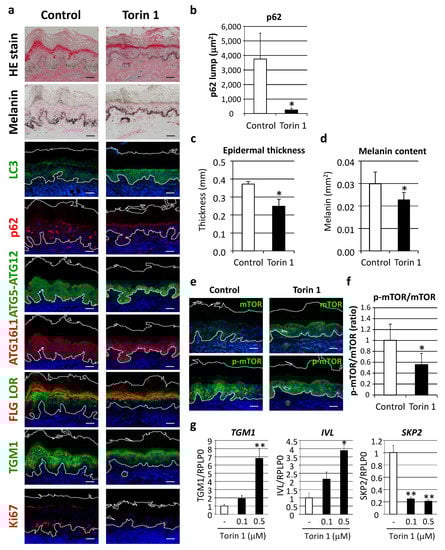 In order to verify the concept of autophagy restoration to improve the appearance of hyperpigmentation, as well as dysregulated epidermal differentiation, the effect of autophagy induction was evaluated in cultured human skin tissues ex vivo. Torin 1, a potent mTORC1 inhibitor, significantly restored LC3 protein along with decreased p62 protein aggregates (Figure 7a,b). Epidermal thickness and melanin deposition were confirmed to be significantly decreased by Torin 1 (Figure 7a,c,d) in parallel with normalized autophagic proteins, such as ATG5-ATG12 and ATG16L1 (Figure 5). In addition, keratinocyte differentiation and proliferation were ameliorated, as indicated by organized distributions of filaggrin, loricrin and TGM1 to the upper granular layer, along with suppression of Ki67-positive cells (Figure 7a). Torin 1-induced mTOR inhibition was also confirmed by findings of significant suppression of mTOR phosphorylation (Figure 7e,f).