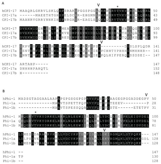 Protein sequences of zebrafish Cpi-17 and Phi-1 paralogs aligned to their human orthologs. (A). Protein alignment of zebrafish Cpi-17a and Cpi-17b with human Cpi-17. (B). Protein alignments of zebrafish Phi-1a and Phi-1b with human Phi-1. The conserved 86-residue long conserved PHIN domain is marked with flanking V, with inhibitory phosphorylation sites T31 (Cpi-17a), T37 (Cpi-17b), T35 (Phi-1a), and T38 (Phi-1b) indicated by *.