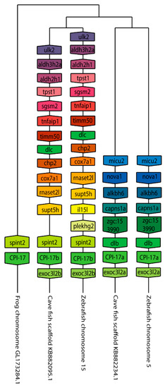 We next set out to better understand the evolution of the ppp1r14 family by analyzing the genomic organization and synteny of the duplicated Cpi-17 and Phi-1 genes in teleosts, using the genomicus browser [53]. The zebrafish genes were compared to the cavefish Astyanax mexicanus, which like zebrafish, is a cypriniform and underwent the teleost WGD. Xenopus laevis was used as an outgroup for the ppp1r14a genes, and Lepisosteus oculatus was used for ppp1r14b genes; neither species’ genome underwent the teleost WGD. Xenopus laevis encodes ppp1r14a on chromosome 8, adjacent to the serine protease inhibitor spint2 (Figure 3). Zebrafish ppp1r14aa is found on chromosome 5, while ppp1r14ab was encoded on chromosome 15. In both zebrafish and cavefish, the synteny with spint2 was conserved with ppp1r14aa, but not with ppp1r14ab. The duplicated genes for ppp1r14a in both zebrafish and cavefish are flanked by multiple duplicated genes, including the delta genes (dlb and dlc) and the excocyst component-like genes exco3l2a and exco3l2b, each of which appear to be the product of the teleost WGD. Other flanking genes show considerable conservation in order and orientation between zebrafish and cavefish (Figure 3). In the gar Lepisosteus oculatus, ppp1r14b was found on the chromosome LG28 flanked by multiple genes, including the solute carrier family 8 member slc8a4b, the leucine rich repeat and fibronectin type III domain containing irfn4b, and the pyruvate carboxylase pcxb (Figure 4). The duplicated zebrafish ppp1r14ba (chromosome 21) and pppr14bb (chromosome 7) genes show conserved synteny of these genes with gar and with cavefish. Paralog pairs were found for the flanking genes slc8a4a, irfn4b, and pcxb (Figure 4). Thus, these data are consistent with the four ppp1r14a and ppp1r14b genes, being the product of the teleost WGD.