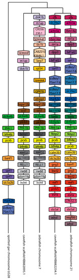 - Muffato, M.; Louis, A.; Poisnel, C.E.; Crollius, H.R. Genomicus: A database and a browser to study gene synteny in modern and ancestral genomes. Bioinformatics 2010. [Google Scholar] [CrossRef] [PubMed]
