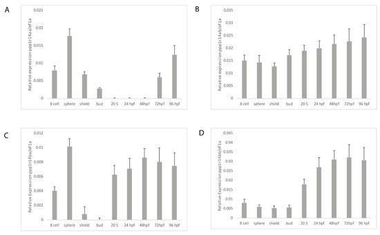 Expression of ppp1r14a and ppp1r14b paralogs during early embryonic development in zebrafish. Embryos were collected shortly after fertilization (8 cell), at sphere stage (4 hpf), shield stage (6 hpf), bud stage (10 hpf), 20 somite stage, Prim-5 stage (24 hpf), long-pec stage (48 hpf), protruding-month stage (72 hpf), and day 4 (96 hpf). Amplification of eF1a and total RNA without addition of reverse transcriptase were used as positive and negative controls, respectively. (A) Gene specific primers were used to detect ppp1r14aa (A), ppp1r14ab (B), ppp1r14ba (C), or ppp1r14bb (D). Values are means of three biological replicates performed in duplicate. Error bars represent standard deviation. All values are reported as expression relative to ef1a.