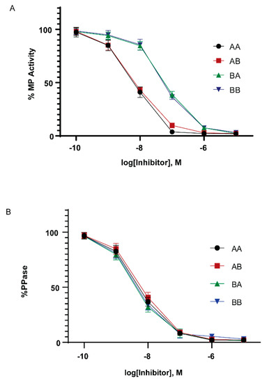 In vitro inhibition of myosin phosphatase by Cpi-17 and Phi-1 paralogs. (A) The myosin phosphatase holoenzyme was isolated from HEK cells and used to dephosphorylate recombinant Mlc2. Increasing concentrations of thiophosphorylated ppp1r14aa (AA, circle), ppp1r14ab (AB, red square), ppp1r14ba (BA, green triangle), or ppp1r14bb (BB, blue triangle) proteins were added, and the extent of Mlc2 dephosphorylation is reported as percent phosphatase activity. (B) Isolated PP1catalytic subunit was used to dephosphorylate Mlc2. Increasing concentrations of thiophosphorylated ppp1r14aa (AA, circle), ppp1r14ab (AB, red square), ppp1r14ba (BA, green triangle), or ppp1r14bb (BB, blue triangle) proteins were added, and the extent of Mlc2 dephosphorylation is reported as percent phosphatase activity. Each experiment was repeated three times in duplicate, and error bars indicate standard error.