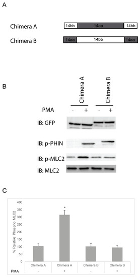 Cpi-17/Phi-1 chimeric proteins indicate that the PHIN domain is required for Myosin Phosphatase specificity. (A,B) HeLa cells were transfected with either chimera A, which contains the PHIN domain of ppp1r14aa and the N and C-termini of ppp1r14bb, or chimera B, which contains the PHIN domain of ppp1r14bb and the N and C-termini of ppp1r14aa. Notably, 15 h post transfection cells were treated with either 1 µM PMA or 0.1% DMSO for 3 h, and lysates were blotted with anti-GFP, anti-phospho-PHIN, anti-Mlc2, and anti phospho-Mlc2. (C) Mlc2 phosphorylation was normalized to total Mlc2 content and is shown as fold change compared with cells expressing the empty GFP-vector. Error bars indicate standard error, and an * indicates a statistically significant difference from control. Statistical significance was calculated using a one-factor ANOVA with Holm–Šídák post-hoc analysis and is defined as p < 0.05 from at least four biological replicates.