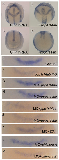 Expression of Cpi-17 paralogs, but not Phi-1 paralogs, can rescue ppp1r14ab loss-of-function. Embryos at bud stage stained with hgg1 (prechordal plate), shh (midline), pax2.1 (midbrain-hindbrain boundary), and dlx3 (neural plate) after injection of 200 pg GFP (A,B) or 200 pg ppp1r14aa mRNA (C,D). (E–M) embryos were collected at 10.5 hpf and stained with fgf3 after injection of 4ng of control MO (E), 4 ng of ppp1r14ab MO (F), 50pg of ppp1r14aa mRNA + 4 ng of ppp1r14ab MO (G), 50pg of ppp1r14ab mRNA + 4 ng of ppp1r14ab MO (H), 50pg of ppp1r14bb mRNA + 4 ng of ppp1r14ab MO (I), 50pg of ppp1r14aa mRNA + 4 ng of ppp1r14ab MO (J), 50pg of ppp1r14aa T38A mRNA + 4 ng of ppp1r14ab MO (K), 50 pg chimera A mRNA + 4 ng of ppp1r14ab MO (L), or 50ng chimera B mRNA 4 ng of ppp1r14ab MO (M).