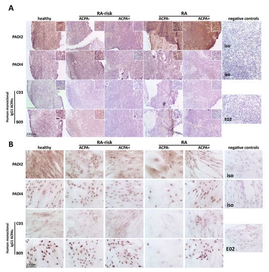 Expression of peptidylarginine deiminases (PADIs) and citrullinated proteins targeted by anti-citrullinated protein antibodies (ACPAs) in lymph node (LN) tissue and cultured lymph node stromal cells (LNSCs). (A) LN tissue was stained for PADI2 and PADI4 proteins and citrullinated proteins targeted by ACPAs using human monoclonal antibodies C03 and B09. Staining with isotype control (iso) (healthy LN tissues for PADI2 and PADI4 are represented) or control antibody E02 (rheumatoid arthritis (RA) ACPA+ patients LN tissue is represented) was negative. A representative picture of each donor group of the immunohistochemical analysis in LN tissue is displayed (n = 3 per donor group; healthy individuals, RA-risk ACPA− individuals, RA-risk APCA+ individuals, RA ACPA− patients, and RA ACPA+ patients). (B) Cultured LNSCs were stained against PADI2 and PADI4 protein and citrullinated proteins targeted by ACPAs using human monoclonal antibodies C03 and B09. Staining with isotype controls (iso; RA-risk ACPA+ individuals LNSCs for PADI2 and healthy individuals LNSCs for PADI4 are represented) and control antibody E02 (RA ACPA+ patients LNSCs is represented) was negative. A representative picture of each donor per group of the immunohistochemical analysis in cultured LNSCs is displayed (n = 3 per donor group; healthy individuals, RA-risk ACPA− individuals, RA-risk APCA+ individuals, RA ACPA− patients and RA ACPA+ patients, passages 3–11). The larger bar in the left corner of images represents 200 µm and the smaller bar inside the magnified images in (A) represents 20 µm.