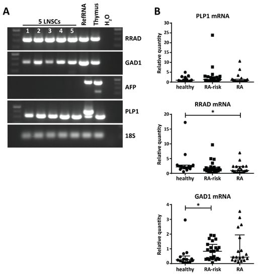 Expression of disease-related PTAs in human LNSCs. (A) mRNA expression of Ras Related Glycolysis Inhibitor and Calcium Channel Regulator (RRAD), Glutamate Decarboxylase 1 (GAD1), Proteolipid Protein 1 (PLP1), and Alpha Fetoprotein (AFP) in five LNSC individuals (1: healthy individuals passage 4; 2: RA-risk individuals passage 4; 3: RA patients passage 4; 4: RA patients passage 4; 5: RA patients passage 3) analyzed by PCR and visualized on agarose gel. cDNA prepared from an arbitrary in house-made RNA sample pool containing all human tissues (RefRNA) as well as a human thymus sample served as positive control and H2O in exchange for cDNA as negative control. (B) Expression of PLP1, RRAD, and GAD1 and was assessed by qPCR in different donor groups (healthy individuals n = 14, RA-risk individuals n = 23, and RA patients n = 24, all passage 2). Relative quantity is displayed as median and interquartile range. Differences between donor groups were assessed by Kruskal–Wallis followed by a post Dunn’s test. * p < 0.050.