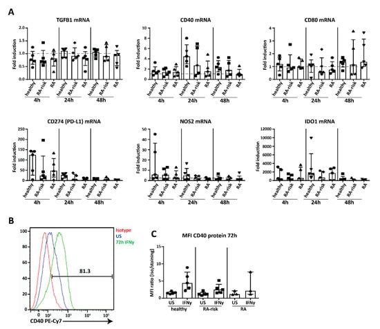 Next we analyzed the expression of genes potentially involved in LNSC-mediated T cell modulation, thereby we used IFNγ, which is produced by T cells upon their activation and differentiation, as a stimulus [41]. Genes analyzed in cultured LNSCs of passages 4–9 after 4, 24, and 48 h stimulation included interferon gamma receptor 1 (IFNGR1), co-stimulatory molecules cluster of differentiation 40 (CD40), CD80 and CD86 [27,42], immunosuppressive cytokines interleukin 10 (IL-10) and transforming growth factor beta 1 (TGFB1), which are both involved in Treg cell induction [43,44], and the negative T cell regulators CD274 (programmed cell death 1 ligand (PD-L1)), nitric oxide synthase 2 (NOS2) and indoleamine 2,3-dioxygenase 1 (IDO1) [25,26] (Figure 5A, healthy individuals n = 5, RA-risk individuals n = 5, and RA patients n = 5, passages 4–9). Under homeostatic conditions no differences between donor groups were observed. IFNGR1 was stably expressed, at similar levels in all donor groups and unaffected by stimulation (Figure S3), showing that all donor groups are equally equipped to respond to IFNγ. TGFB1 was strongly expressed under homeostatic conditions and not strongly affected by IFNγ (Figure 5A). In contrast, IL-10 was not detected by qPCR. For the co-stimulatory molecules, we found that CD40 was strongly expressed and slightly induced at 24 h, while expression of CD80 was very low and CD86 was undetectable (Figure 5A). On the other hand, the negative regulators CD274 (PD-L1), NOS2, and IDO1 strongly responded to IFNγ, with CD274 (PD-L1) and NOS2 expression peaking at 4 h and IDO1 at 24 h (Figure 5A). Furthermore, at protein level we could detect CD40 by flow cytometry on cultured human LNSCs and expression was upregulated after 72 h stimulation with IFNγ (Figure 5B) though no significant differences between donor groups were observed (passages 4–9) (Figure 5C). Finally, none of these findings reported here on mRNA or protein level correlated with any clinical parameter such as age, gender, or autoantibody titers. Overall, these data show that human LNSCs have the capacity to modulate the adaptive immunity.