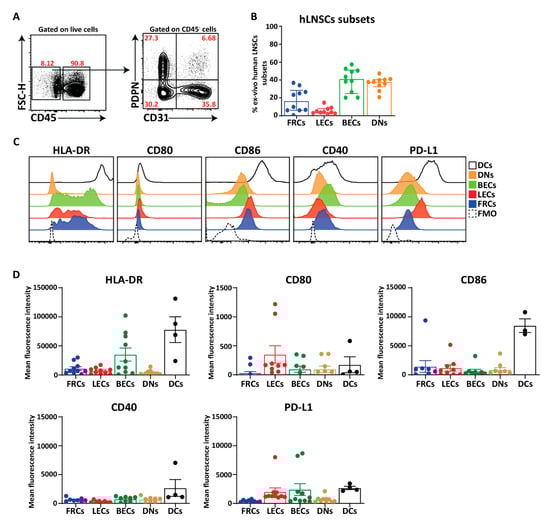 Expression of HLA-DR and co-stimulatory molecules on freshly isolated human LNSCs. (A) Human LNs obtained from kidney transplantation recipients were enzymatically digested, and stained for LNSC subsets based on the expression of CD31 and Podoplanin (PDPN) when gated on live CD45− cells. (B) Scatter plot represents the frequencies of different subsets of human LNSCs (hLNSCs) directly after digestion. (C) Stromal cells were gated as live CD45− cells and expression of co-stimulatory and inhibitory molecules on different subclasses of LNSCs and CD45+CD11c+ dendritic cells (DCs) were assessed using flow cytometry. Histograms show the expression of indicated molecules on different stromal cell subsets and DCs. The fluorescence minus one (FMO) was used as negative control. (D) Scatter plots represent mean fluorescence intensity of HLA-DR, CD80, CD86, CD40, and PD-L1 of each subset of LNSCs when gated on live CD45− cells in comparison to DCs. Data are represented as mean with SEM (n = 3–10 kidney recipients).