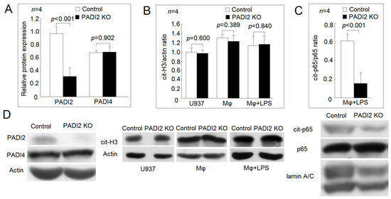 We confirmed the protein expression of PADI2 was dramatically decreased after gene knockout using the CRISPR–Cas system (Figure 1A). PADI2 and PADI4 are homologous in their structures and amino acid sequences in human [2]. We found that the protein expression of PADI4 did not change in the U937 cells after PADI2 knockout compared with those in the controls (Figure 1A). Next, we analyzed the protein levels for cit-H3. In the U397 cells, the differentiated macrophages, and the macrophages stimulated with LPS, the protein levels of cit-H3 were not different between the PADI2 knockout group and the controls (Figure 1B). Sun et al. reported that PADI4 could citrullinate nuclear factor κB (NF-κB) p65 and enhance its nuclear translocation and transcriptional activity [11]. We found that the protein levels of the citrullinated p65 were decreased in the nuclear extract of macrophages stimulated with LPS in the PADI2 knockout group compared with in the controls (Figure 1C,D).