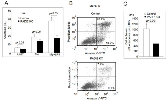 As expected, the apoptotic rate was significantly elevated in the differentiated macrophages compared with in the U937 cells. The addition of LPS further increased the apoptotic rate of the macrophages in both the PADI2 knockout group and the control group (Figure 3A,B). The PADI2 knockout group significantly decreased the apoptotic rates in the U937 cells, the differentiated macrophages, and the macrophages stimulated with LPS compared with the control group. We also noticed that the PADI2 knockout macrophages were more easily detached during trypsinization compared with the controls. Stefanelli et al. showed that protein citrullination could alter focal adhesion stability [12]. Therefore, we speculated that PADI2 knockout might also impair the macrophage adhesion. Using a commercially available fibrinogen-coated plate, we found that the PADI2 knockout group had impaired cell adhesion ability compared with the control group (Figure 3C).