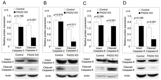 Effects of PADI2 knockout on the relative expression levels of the activated caspase-3, -2, -8, and -9. In the differentiated macrophages stimulated with LPS, the protein expression levels of the intact caspases and the cleaved caspases were performed by Western blotting in the PADI2 knockout group and the control group. The relative protein expression was defined as the ratio of intact caspases or cleaved caspases to the actin band intensity: (A) caspase-3; (B) caspase-2; (C) caspase-8; (D) caspase-9.