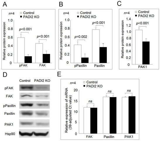 Effects of PADI2 knockout in the protein and mRNA expression of FAK, paxillin, and PAK1 in the differentiated macrophages: (A) comparison of the relative protein expression levels of FAK and phospho-FAK in the PADI2 knockout group and the control group; (B) comparison of the relative protein expression levels of paxillin and phospho-paxillin in the PADI2 knockout group and the control group; (C) comparison of the relative protein expression levels of PAK1 in the PADI2 knockout group and the control group; and (D) Representative images showing the relative protein expression levels of FAK, paxillin, and PAK1 in the PADI2 knockout group and the control group; (E) the relative mRNA expression levels of FAK, paxillin, and PAK1. In differentiated macrophages, the protein expression levels of the cell adhesion-related proteins including FAK, phospho-FAK, paxillin, phospho-paxillin, and PAK1 were performed by Western blotting in the PADI2 knockout group and the control group. The relative protein expression was defined as the ratio of a specific protein/hsp90 band intensity.
