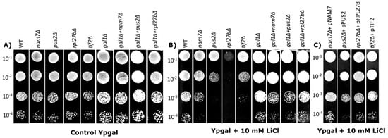 LiCl targets PGM2 expression which leads to an accumulation of galactose intermediate metabolites, which becomes toxic for yeast cells including galactose-1-p [14,15,29]. In yeast, GAL1 is the galactokinase that phosphorylates α-d-galactose to α-d-galactose-1-phosphate in the first step of galactose catabolism. The PGM2 enzyme facilitates the entry of galactose into glycolysis and converts glucose-1-phosphate to glucose-6-phosphate. To investigate the influence of NAM7, PUS2, and RPL27B on LiCl toxicity through galactose metabolism, we generated double gene deletions for NAM7, PUS2, and RPL27B with the GAL1 gene. We observed that when GAL1 was deleted, double mutant cells did not show sensitivity to LiCl treatment (Figure 1B).