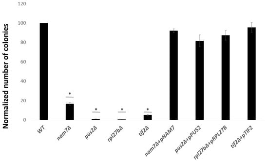 Quantitative analysis of LiCl sensitivity for different yeast strains. Average number of colonies formed for different yeast strains in the presence of LiCl (10 mM) were normalized to that for WT strain. nam7Δ, pus2Δ, and rpl27bΔ show less colonies under LiCl treatment. Over-expression of target genes in their corresponding deletion mutants reverted cell sensitivity to LiCl. * (p-value ≤ 0.05) represent statistically significant results compared to WT. Data represents the average from three independent experiments and error bars represent standard deviation.