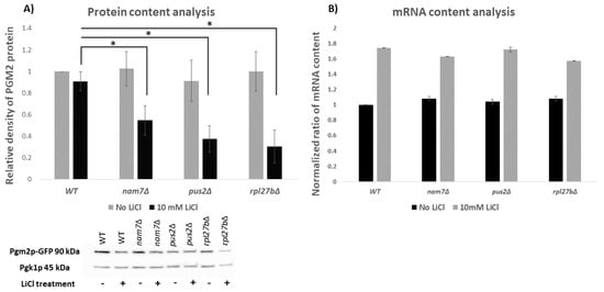 Protein and mRNA content analysis. (A) Protein content analysis of Pgm2p-GFP protein in deletion yeast strains for nam7Δ, pus2Δ, and rpl27bΔ. Western blot analysis was used to measure the protein content for Pgm2p-GFP protein in the absence or presence of LiCl (10 mM). Pgk1p was used as housekeeping gene and the values are normalized to that. (B) mRNA content analysis of PGM2 in nam7Δ, pus2Δ, and rpl27bΔ. qRT-PCR was used to evaluate the content of PGM2 mRNA in yeast gene deletion mutants related to WT strain and normalized to PGK1 mRNA levels. Each experiment was repeated at least three times. * (p-value ≤ 0.05) represent statistically significant results compared to WT. Error bars represent standard deviation.