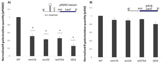The 5′-UTR of PGM2 mRNA has a highly structured region [30] (Figure S2). PGM2 expression is severely reduced in the absence of translation initiation helicase TIF2, a protein responsible for unwinding mRNA structures during translation [14]. Since we observed that NAM7, PUS2, and RPL27B are likely to function in the translation pathway, we decided to examine if these genes are possibly impacting translation of highly structured mRNAs. For this experiment, we inserted 5′-UTR of PGM2 in front of a LacZ expression cassette of p416 plasmid (pPGM2). From here, pPGM2 was then transformed into deletion mutant strains of our candidate genes and WT. β-galactosidase activity was measured as a reference for translation activity (Figure 4A). It was shown that translation activity significantly decreased in Nam7Δ, Pus2Δ, and Rpl27bΔ carrying plasmid with hairpin when compared to translation activity with control plasmid (Figure 4B).