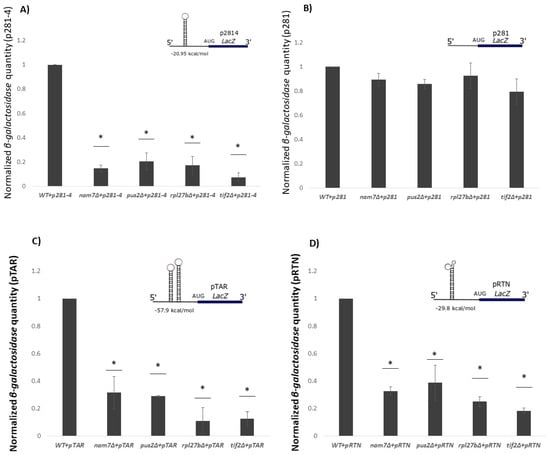 To investigate whether this effect is specific to the 5′-UTR of PGM2 mRNA, we used a second construct with a strong hairpin structure on its 5′-UTR (p281-4) [31]. As a control, we used p281, which lacks a secondary structure [31]. We observed that β-galactosidase activity was reduced in p281-4 when NAM7, PUS2, or RPL27B was deleted, whereas, for p281, there was no significant difference between the mutants and WT (Figure 5A,B). These results demonstrate that the tested genes do not appear to affect translation of mRNAs lacking structured regions and exert their activities specifically on structured mRNAs.