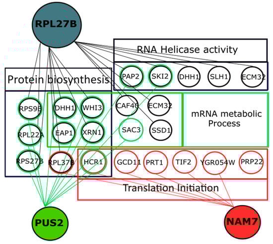 Negative genetic interactions (nGIs) for NAM7, PUS2, and RPL27B. Our data shows a cluster of interactors involved in protein biosynthesis pathway for NAM7 (p = 1.6 × 10−7), PUS2 (p = 4 × 10−8), and RPL27B (p = 1.2 × 10−5). PAP2, SKI2, RPS9B, RPL37B, RPS27B, RPL22A, DHH1, EAP1, WHI3, HCR1, and XRN1 are mutual hits shared between two target genes. Circles represent genes, lines represent nGIs identified in this study.