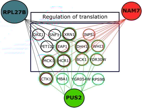 Another form of nGIs, called conditional nGI, can be studied under sub-inhibitory concentration of chemicals. It is used to investigate possible candidate gene functions that are activated under a specific condition [27,50]. For this experiment, we studied nGIs for NAM7, PUS2, and RPL27B under a mild sub-inhibitory concentration of LiCl (3 mM). Shown in Figure 7, new nGIs were observed for our candidate genes. The new interactions hinted to new conditional functions for NAM7, PUS2, and RPL27B in regulation of translation. We observed a number of common interactors between the three query genes including BCK1, CTK1, and MCK1. BCK1 is important in negative regulation of translation under stress conditions. It is involved in deadenylation and decapping of mRNAs to be degraded in connection with DHH1 [51,52,53,54]. On the other hand, CTK1 is a conserved kinase that phosphorylates RPS2p, one of the components of small ribosomal subunit. It affects translation fidelity during elongation, as well as phosphorylation of other translation initiation factors, including eIF4A, eIF5, eIF4G, and eIF3 [55,56]. MCK1 is involved in phosphorylation-dependent protein degradation, among other roles.