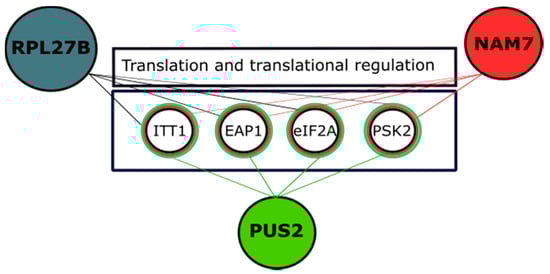 Phenotypic Suppression Array (PSA) analysis focuses on another form of interaction where over-expression of one gene compensates for the absence of another gene, under a drug treatment [26,36,57,58]. Here, we treated the arrays of mutant strains with 10 mM LiCl, and, consequently, some showed sensitivity. Then, we were able to revert LiCl sensitivity in a number of deletions by introducing over-expression plasmid of NAM7, PUS2, and RPL27B. Interestingly, over-expression of NAM7, PUS2, and RPL27B compensated for the sensitivity of four mutual gene deletions ITT1Δ, eIF2AΔ, EAP1Δ, and PSK2Δ (Figure 8). Eap1 encodes for an eIF4E-associated protein that accelerates decapping of mRNA and negatively regulates translation [53]. ITT1 interacts with the translation release factor eRF3 and modulates the efficiency of translation termination. eRF3 is not only important in regulation of translation termination and cell cycle regulation but also is shown to mediate mRNA decay through interaction with UPF family of proteins that include one of our query genes NAM7 [59]. Itt1p interacts with Mtt1p, an RNA helicase and poly(A) binding protein Pab1p involved in mRNA circularization and ribosome recycling [59,60]. eIF2A deletion also showed sensitivity to 10 mM LiCl and was reverted by over-expression of NAM7, PUS2, and RPL27B in our experiments. eIF2A, a translation initiation factor, is shown to regulate IRES-mediated translation and because of its physical interaction with Ded1p and eIF4A, it has been suggested to play a role in translation regulation of certain mRNAs [61]. PSK2 is known to be important in regulating both sugar metabolism and translation through phosphorylation of intermediate molecules [62]. In addition, PSK2 is shown to function as a trans-acting factor for translational regulation of mRNAs with upper Open Reading Frames (uORFs), including ROK1 that encodes an RNA helicase [63].