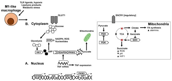 The hypoxia sensor hypoxia-inducible factor (HIF)-1-α is an important link between glycolytic programming and inflammation. HIF1α is stabilised in macrophages by succinate, a metabolite of the tricarboxylic acid (TCA) cycle that accumulates with increasing glycolytic flux []. The stabilisation of HIF1α allows its transcriptional activity to take place, inducing expression of GLUT1 as well as the expression of inflammatory mediators such as IL1B, with the pyruvate kinase isoenzyme (PKM)-2 as a coregulator. PKM2 canonically catalyses the last step of glycolysis, being responsible for net ATP and pyruvate production. In M1 macrophages, it also acts as a transcriptional coregulator [,]. The HIF1α pathway has itself been validated to play a role in metabolic diseases, where HIF1α deficient mice are protected against diet-induced obesity and insulin resistance.