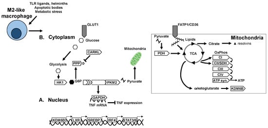 Much less frequently, glycolysis has also been reported in alternatively activated macrophages. Precisely, macrophage stimulation with IL4 and MCSF leads to activation of mTORC2 and the upregulation of glycolysis through IRF4 []. However, a subtle difference in the glycolytic programming of alternatively activated macrophages is that glycolysis products are directed towards mitochondria rather than towards the PPP. This supports the TCA cycle and mitochondrial oxidative phosphorylation (OXPHOS); accordingly, other studies have shown that 2-deoxyglucose mediated inhibition of glycolysis also attenuates mitochondrial metabolism and M2 marker expression in response to IL4 [].