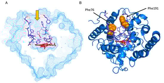Visual inspection of the crystallographic structure of PaDa-I (PDB ID: 5OXU) allowed the identification of a channel connecting the distal side of the heme prosthetic group to the bulk solvent (Figure 1). Among the residues conforming this channel, two phenylalanine residues can be clearly identified that orient their side chain moiety towards the channel, namely Phe76 and Phe191, located 10 Å and 14 Å away from the heme iron, respectively (Figure 1). It has been suggested that these residues regulate the entrance of substrates to the heme channel and may impose an upper limit to the size of substrates that can access the active site []. Thus, bulky substrates, such as the PAHs pentacene and fluorene, are not oxidized by AaeUPO, probably because they cannot be accommodated close to the heme group, according to molecular docking simulations []. According to previously reported crystallographic data, the residue Phe191 is more flexible in the PaDa-I variant, with respect to the wild-type AaeUPO, due to the effect of the mutation F311L; apparently, the smaller side chain in Leu displaces the side chain in Phe76 and this weakens the interaction with Phe191 []. However, as mentioned before, this has no effect on the catalytic behavior of the PaDa-I variant.