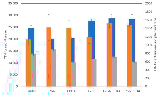 Total turnover number (TTN) of PaDa-I and all the variants with PAHs: naphthalene (blue), anthracene (orange), and phenanthrene (gray). TTN is expressed as moles of substrate converted per mole of enzyme used.