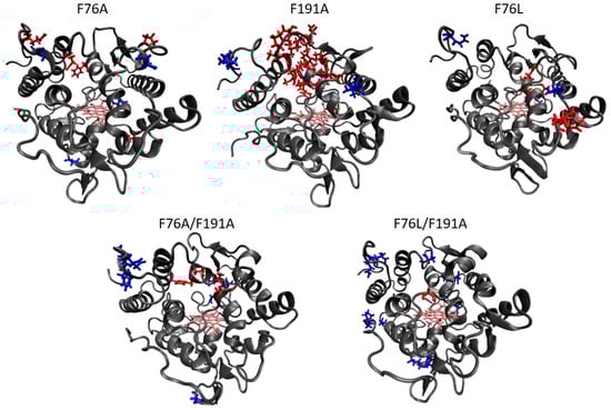 In order to further identify the role of residues shaping the topography of the active site, molecular dynamics (MD) simulations were performed and the behavior of residues within the channel was analyzed for PaDa-I and the in silico-constructed variants F76A, F76L, and F191A and the double mutants F76A/F191A and F76L/F191A. It was observed that the average root-mean-square deviation (RMSD) of the whole protein for PaDa-I and the mutants showed a similar behavior, with average RMSD ranging from 1.8 to 2.8 Å (Figure S6, Supplementary Materials). Furthermore, the RMSD of the residues that constitute the heme channel showed a similar behavior in all the enzyme variants (Figure S7, Supplementary Materials).