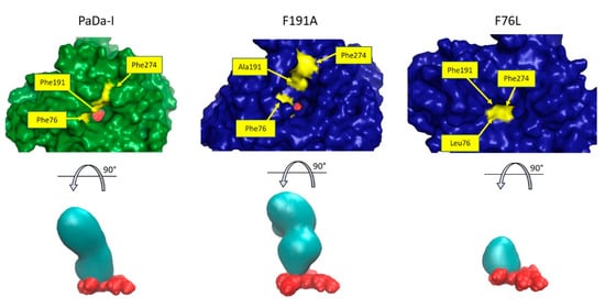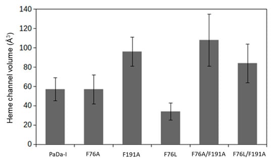 In Figure 6, the topography of the cavity formed by residues in the channel is depicted for PaDa-I and the F76L and F191A single mutants; the shape of the cavities for all the variants can be seen in Figure S9 (Supplementary Materials). The changes in topography could be related largely to a rearrangement of the above-mentioned heme channel residues, because the rotational behavior and conformation of the Phe side chains is not altered in the mutants (Figure S10, Supplementary Materials). It is clear that in both mutants the topography of the channel is greatly altered, compared to PaDa-I. While for the F191A variant the cavity defining the channel acquires a more irregular shape, in the F76L variant the cavity is greatly reduced; in both cases, substrate access to the channel could be restricted.