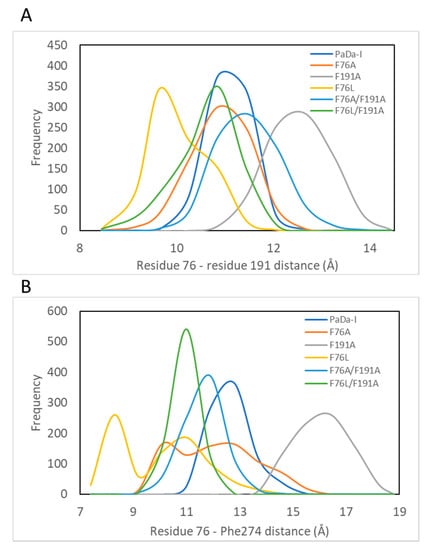In order to clarify the specific mobility changes that may alter the topography of the heme channel, the arrangement of the loop that contains Phe274 and the helix that harbors the residue in position 191 was analyzed. The most notable arrangement occurs in the F76L variant, where the Phe274 and Phe191 residues move closer to the Leu76 residue (Figure 5); this could explain the reduced channel volume in this variant. On the contrary, a larger channel volume in the F191A variant is the result of a structural rearrangement that is associated with a higher dynamic behavior of the region (Figure 3 and Figure 5); for example, an increased distance between Ala191-Phe274 and Phe76-Ala191 residues is observed (Figure 5). In the case of the F76A/F191A variant, the higher variability of the channel volume (Figure 4) reflects a more dynamic topography as the Phe274-Ala76 distance decreases, whereas the Ala191-Ala76 distance increases (Figure 5). Although in the F76A variant the Phe274 residue explores conformations in which it moves closer to the Ala76 residue, it does not significantly alter the location of Phe191 and Phe274 residues with respect to Ala76, which is in accordance with a heme channel volume similar to PaDa-I, while the double mutant F76L/F191A shows an intermediate behavior between its corresponding single mutants (Figure 5).
