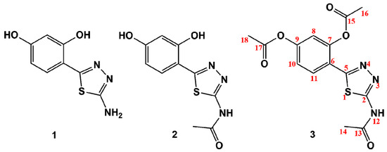 Structures of the 1,3,4-thiadiazole-derived ligands 1, 2, 3, and the numbering system of atoms (red) used for the assignment of the 1H and 13C NMR chemical shifts.