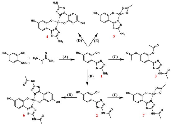 In the first synthetic step 2-amino-5(2,4-dihydroxyphenyl)-1,3,4-thiadiazole 1 was obtained as result of the classical POCl3-mediated reaction between 2,4-dihydroxybenzoic acid and thiosemicarbazide. Compound 1 was then acetylated with use of aqueous acetic anhydride yielding the amide derivative 2, while the addition of catalytic amount of H2SO4 allowed the formation of fully acetylated derivative 3. All thiadiazole derivatives 1–3 were then reacted with Cu(II) and Zn(II) acetate salts, which in the case of compounds 1 and 2 resulted in the formation of their respective Cu(II) and Zn(II) complexes 4–7. Compound 3 did not form any metal complexes with the metal salts used. The synthetic pathway illustrating the syntheses of thiadiazole derivatives is given in Figure 2.