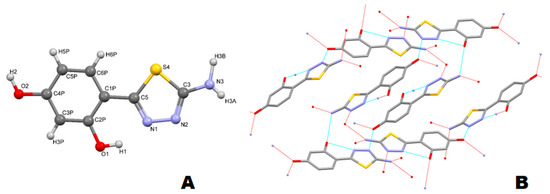 The asymmetric part of unit cell contains one planar molecule. In the solid state the rotation in the molecule is prevented by a hydrogen bond between the phenolic o-hydroxyl group and the neighboring N atom of the thiadiazole ring. Both hydroxyl groups are involved in the formation of intermolecular hydrogen bonds (Figure 3B). The o-hydroxyl group forms an intramolecular H-bond with the amine moiety of neighboring molecule with a distance A..H of 2.236 Å. The second phenolic -OH interacts with two neighboring molecules acting as both an acceptor of hydrogen bond from the amine group (A H 1.842 Å), and as a donor of H-bond to the nitrogen atoms from thiadiazole ring (D‒H A: 1.757 Å and 2.558 Å) (first and second neighboring molecule, respectively). The resorcynyl rings of thiadiazole molecules from neighboring layers (distance of 3.36 Å) interact through π···π stacking interactions. The bond lengths and valence angles in the thiadiazole molecule are similar to those previously measured for structurally similar derivatives (within error bars). The detailed crystallographic data for 1 is given in (Figure S7, Table 3 and Tables S1–S3).