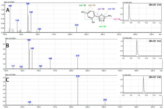 Mass spectra of thiadiazole derivatives 1, 2, and 3 (A, B, and C, respectively) together with their respective mass chromatograms (insets).
