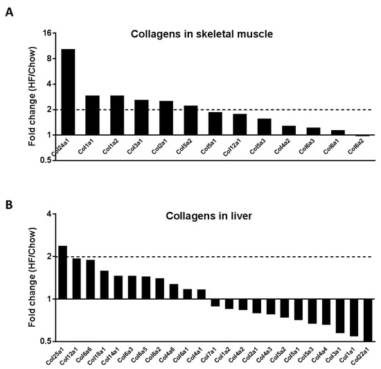 Proteomic detection of collagens in the extracellular matrix (ECM) of skeletal muscle and liver of chow- and high fat (HF)-fed mice. Gastrocnemius muscle and liver from chow- and HF-fed mice were decellularised by 1% SDS for 5–7 days before subjected to quantitative proteomics using iTRAQ (isobaric tags for relative and absolute quantitation) labelling peptide analysis. Data were presented as the ratio of the mean of samples from HF-fed mice over the mean of samples from chow-fed mice. (A) Collagen protein changes in the gastrocnemius muscle. n = 3:3. (B) Collagen protein changes in the liver. n = 3:4 (Chow:HF).