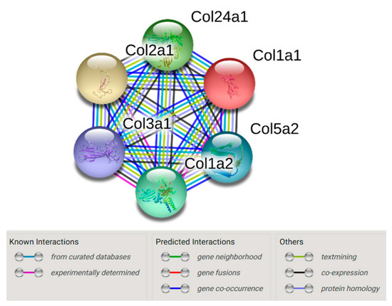 As Col24α1 was increased by >10-fold in the muscle of insulin-resistant mice, we further examined its association with diet-induced insulin resistance. Collagen 24α1 is a fibril-forming collagen and it was not previously known to be associated with insulin resistance. Using a mouse protein–protein interaction database (STRING, www.string-db.org) [17], we showed that collagen 24α1 interacts with Col1α1, Col1α2, Col2α1, Col3α1 and Col5α2 (Figure 2), therefore providing evidence for how collagen 24α1 may be associated with insulin resistance.