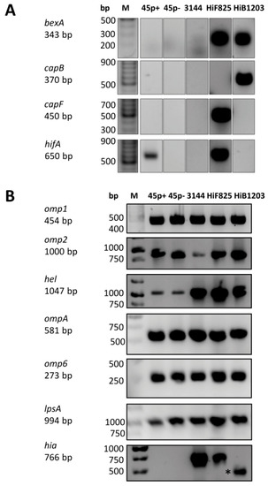 Abbreviations: bexA, capsule expression; capB, capsular B antigene; capF, capsular F antigene; hifA, H. influenzae fimbrial gene; lpsA, lipopolysaccharide glycosyl transferase; hia, H. influenzae adhesin; omp, outer membrane protein; hel, H. influenzae outer membrane lipoprotein e(P4); ompA, outer membrane porin A.