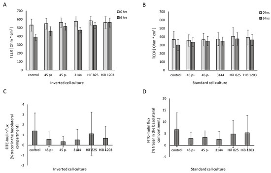 Barrier integrity of HIBCPP cells infected with the indicated NTHI, HiF and HiB isolates Figure 0 h, black bars). TEER values of cells cultured in: (A) the inverted cell culture system; and (B) the standard cell culture system at the time of infection (time point 0 h, grey bars) and at the end of infection (time point 6 h, black bars). Percentage of FITC-labeled inulin flux of HIBCPP cells grown in: (C) the inverted cell culture system; and (D) the standard culture system. Infection was carried out for 6 h, and uninfected control cells were analyzed in parallel. The FITC-inulin flux was measured in apical-to-basolateral direction and is expressed as percentage of tracer in the basolateral compartment. Each experiment was repeated at least three times with at least three replicates. All data are shown as mean and error bars depict standard deviation.