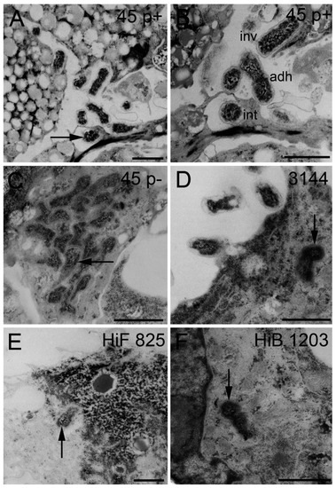 TEM sections of HIBCPP cells grown in the inverted cell culture system infected with indicated NTHI and H. influenzae isolates for 6 h. (A–F) TEM images of intracellular bacteria (black arrow), which invaded from the blood facing side. (B) Different phases of the pathogenesis progress—bacteria adhering to HIBCPP cells, invading into HIBCPP cells and already intracellular of a HIBCPP cell. Scale bars represent 1 µm. inv, invaded; adh, adherend; int, intracellular. “p+” means fimbriated and “p−“ means non-fimbriated.
