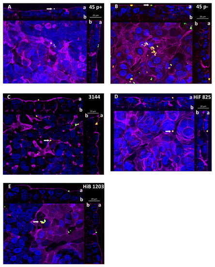 DIF sections of HIBCPP cells depicting cells basolaterally infected with the indicated Haemophilus strains. Cells were grown in the inverted cell culture system and challenged with a MOI of 20 of: (A) the nasopharyngeal NTHI isolate 45 p+ (fimbriated variant); and (B) the nasopharyngeal NTHI isolate 45 p− (non-fimbriated variant); (C) the NTHI CSF isolate 3144; and the encapsulated H. influenzae CSF isolates (D) HiF 825 and (E) HiB 1203. After 6 h of infection, cells were subjected to DIF staining to analyze invasion. Intracellular bacteria are visualized in green and extracellular bacteria in yellow. DAPI (blue) and phalloidin (purple) were used to stain the cell nuclei and the actin cytoskeleton, respectively. (A–E) Apotome images of basolaterally infected HIBCPP cells. The center part of each panel represents the xy en face view. An overlay of selected slices through the z-axis intensifies images for presentation. The top and side parts of each panel represent the cross-sections through the z-plane of slices in the overlay. In the cross sections, the apical cell side facing the top and the right side, respectively, is labeled with “a” and the basolateral cell side facing the center part is labeled with “b”. A characteristic distribution for the individual strains is represented. Invaded bacteria (green) appear as single specimen. Extracellular bacteria (yellow) adhering to the apical cell side are marked with a white arrow. These bacteria represent specimen that have transmigrated through the HIBCPP cell layer from the basolateral side still being attached to the apical cell side.