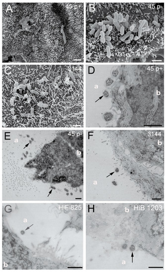 When applied to the apical side of HIBCPP cells, NTHI were found almost only extracellularly adhering to the cells (Figure 5A–C). Invasion events upon infection from the apical side were observed very rarely in the standard culture infected cells. This was also observed for the encapsulated HiB 1203 and HiF 825 CSF isolates (Figure 5D,E). Consequently, NTHI as well as the analyzed HiB and HiF isolates entered HIBCPP cells in the predicted polar fashion (Figure 5A–E). Additional SEM picture sections clearly show NTHI strains 45 p+, 45 p− and 3144 located at the microvilli covered apical cell side (Figure 6A–C), which is in accordance with the extracellular adhered bacteria detected in the DIF. TEM was performed not to miss possible invasion events. In several pictures, we were able to find bacteria adhering to the cells sitting on or next to microvilli of the HIBCPP cells, but not invaded into the cells (Figure 6D–H). Only extremely rarely bacteria were found located between the cells, probably where barrier integrity was not fully maintained (data not shown). Thus, TEM further supports a polar invasion of NTHI into HIBCPP cells from the basolateral side. The same was true for HiB 1203 and HiF 825 CSF isolates, for which invasion from the basolateral side has previously been shown [43]. Both strains hardly show invasion when applied to the apical side (Figure 6G,H). Noteworthy, although in the inverted cell culture model the access of bacteria to the basolateral cell side is limited to areas at the membrane pores (~14% compared to the standard culture), invasion was almost exclusively observed from the basolateral cell side.