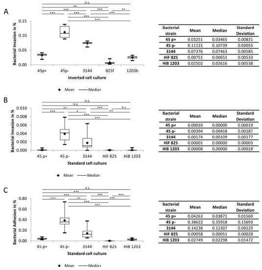 Invasion and Adhesion rates of indicated H. influenzae strains. Invasion upon infection with a MOI of 20 was counted after 6 h of infection: (A) invasion rates in the inverted cell culture (n = 9); (B) invasion rates in the standard cell culture ((n = 12, n = 13 for HiF 825); and (C) adhesion rates in the standard cell culture. Each experiment was repeated at least three times with at least three replicates. All data are shown as mean and median together with quartiles, minimum and maximum. The box depicts the interquartile range (25% and 75%). * p < 0.05; ** p < 0.01; *** p < 0.001; n.s., not significant.