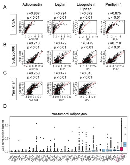 Transcriptionally defined adipocytes have a moderate to strong correlation with representative markers of mature adipocytes. The amount of intratumoral adipocytes in various cancers is also represented. (A) The Cancer Genome Atlas (TCGA) cohort (B) GSE25066 (C) Study by Yau et al. (D) The distribution of the amount of intratumoral adipocytes in various cancer types. ADIPOQ, adiponectin; LEP, leptin; LPL, lipoprotein lipase; PLIN1, perilipin 1; ACC, Adrenocortical carcinoma; BLCA, Bladder Urothelial Carcinoma; BRCA, Breast invasive carcinoma; CESC, Cervical squamous cell carcinoma and endocervical adenocarcinoma; CHOL, Cholangiocarcinoma; COAD, Colon adenocarcinoma; DLBC, Lymphoid Neoplasm Diffuse Large B-cell Lymphoma; ESCA, Esophageal carcinoma; GBM, Glioblastoma multiforme; HNSC, Head and Neck squamous cell carcinoma; KICH, Kidney Chromophobe; KIRC, Kidney renal clear cell carcinoma; KIRP, Kidney renal papillary cell carcinoma; LAML, Acute Myeloid Leukemia; LGG, Brain Lower Grade Glioma; LIHC, Liver hepatocellular carcinoma; LUAD, Lung adenocarcinoma; LUSC, Lung squamous cell carcinoma; MESO, Mesothelioma; OV, Ovarian serous cystadenocarcinoma; PAAD, Pancreatic adenocarcinoma; PCPG, Pheochromocytoma and Paraganglioma; PRAD, Prostate adenocarcinoma; READ, Rectum adenocarcinoma; SARC, Sarcoma; SKCM, Skin Cutaneous Melanoma; STAD, Stomach adenocarcinoma; TGCT, Testicular Germ Cell Tumors; THCA, Thyroid carcinoma; THYM, Thymoma; UCEC, Uterine Corpus Endometrial Carcinoma; UCS, Uterine Carcinosarcoma; UVM, Uveal Melanoma. p-value < 0.05 was considered statistically significant. r represents a Spearman’s correlation coefficient.