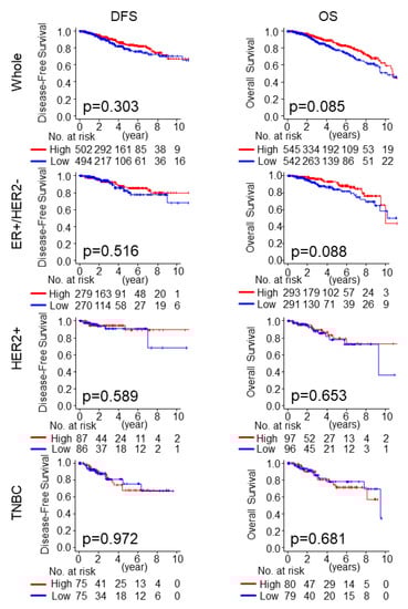 Kaplan Meier survival analysis (Disease-free survival (DFS) and overall survival (OS)) of adipocyte high (red line) vs. low (blue line) breast cancer in whole TCGA breast cancer cohort, ER+/HER2- subtype, Her2+ subtype, and TNBC subtype. The number of patients at risk is shown below the X-axis of each panel. DFS, disease-free survival; OS, overall survival; ER+/HER2-, ER-positive, and HER2 negative; HER2+, HER2 positive; TNBC, triple-negative breast cancer. p-value < 0.05 was considered statistically significant.